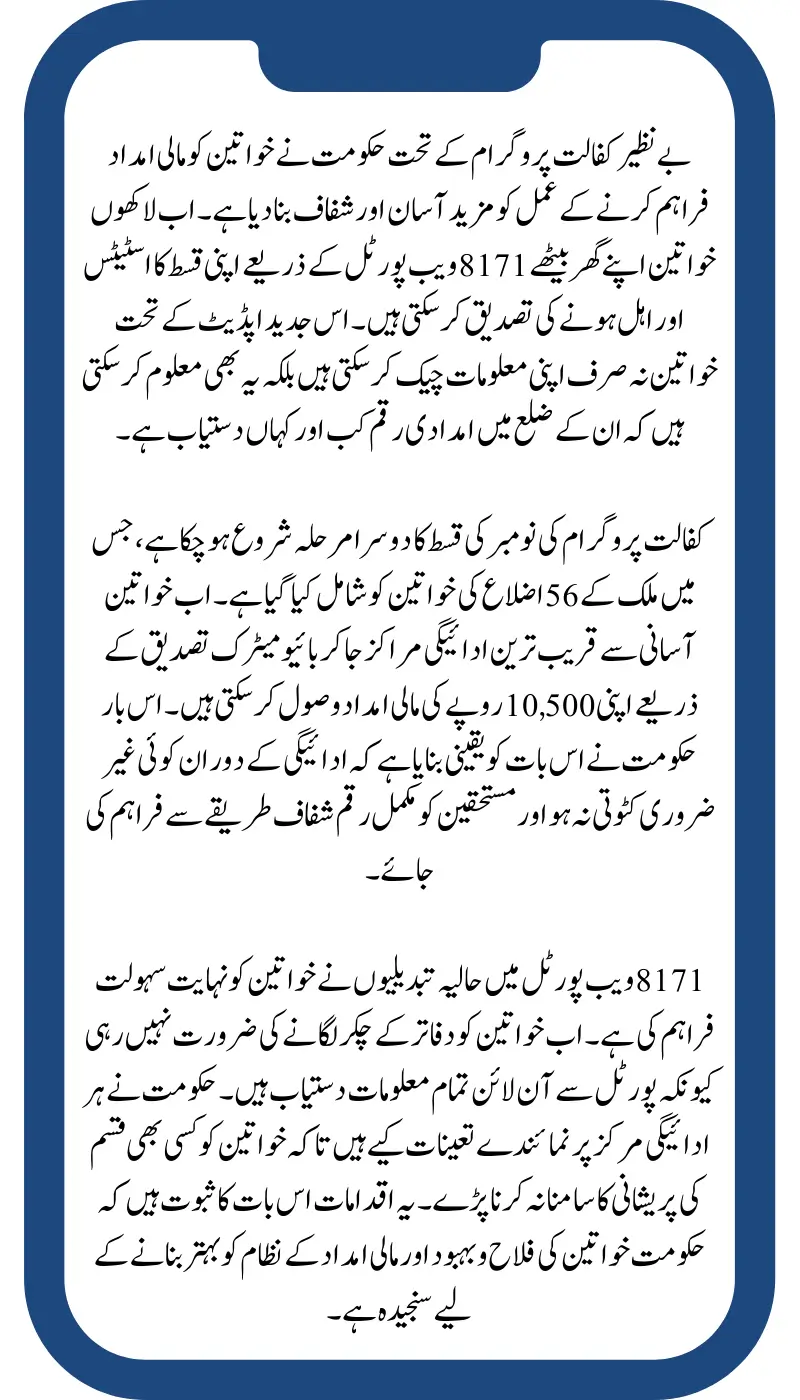 The second phase of the Benazir Kafalat Program payments for January has officially begun. Women from 56 districts are now eligible to collect their quarterly installments. For those who have checked their eligibility through the 8171 portal, the payments are now being distributed smoothly at designated centers.
