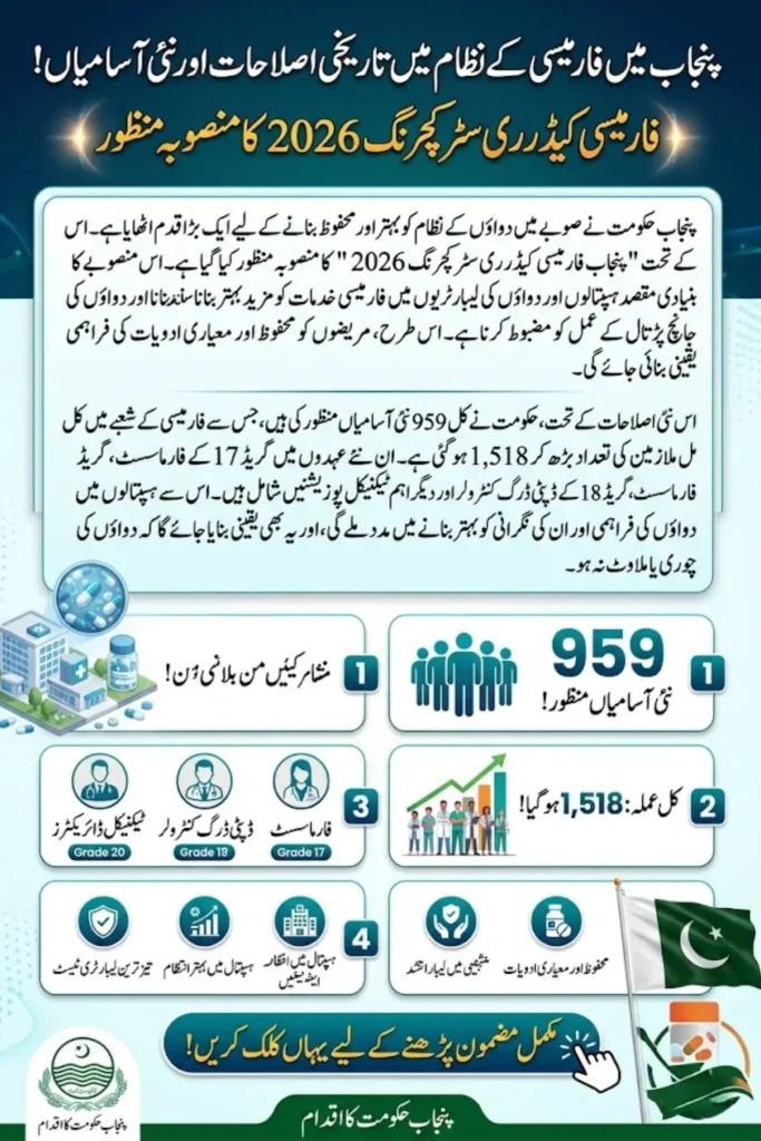 The Punjab Pharmacy Cadre Restructuring 2026 is a major step in healthcare reform. It increases staffing and improves the structure of pharmacy services.